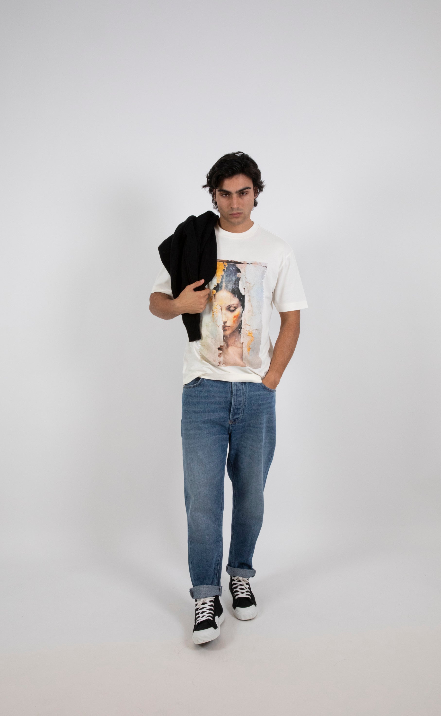 A comfort-fit white t-shirt featuring a bold print on the front designed for a relaxed and stylish look.